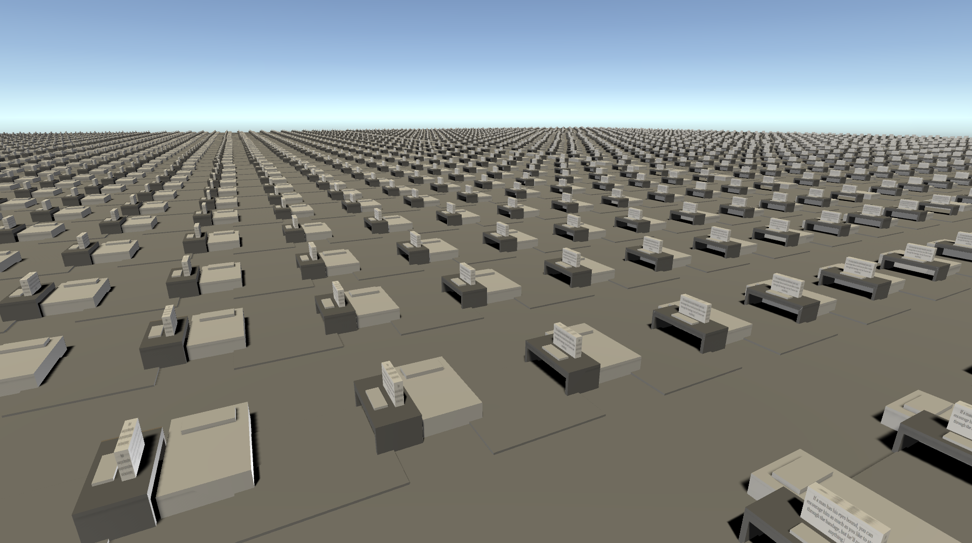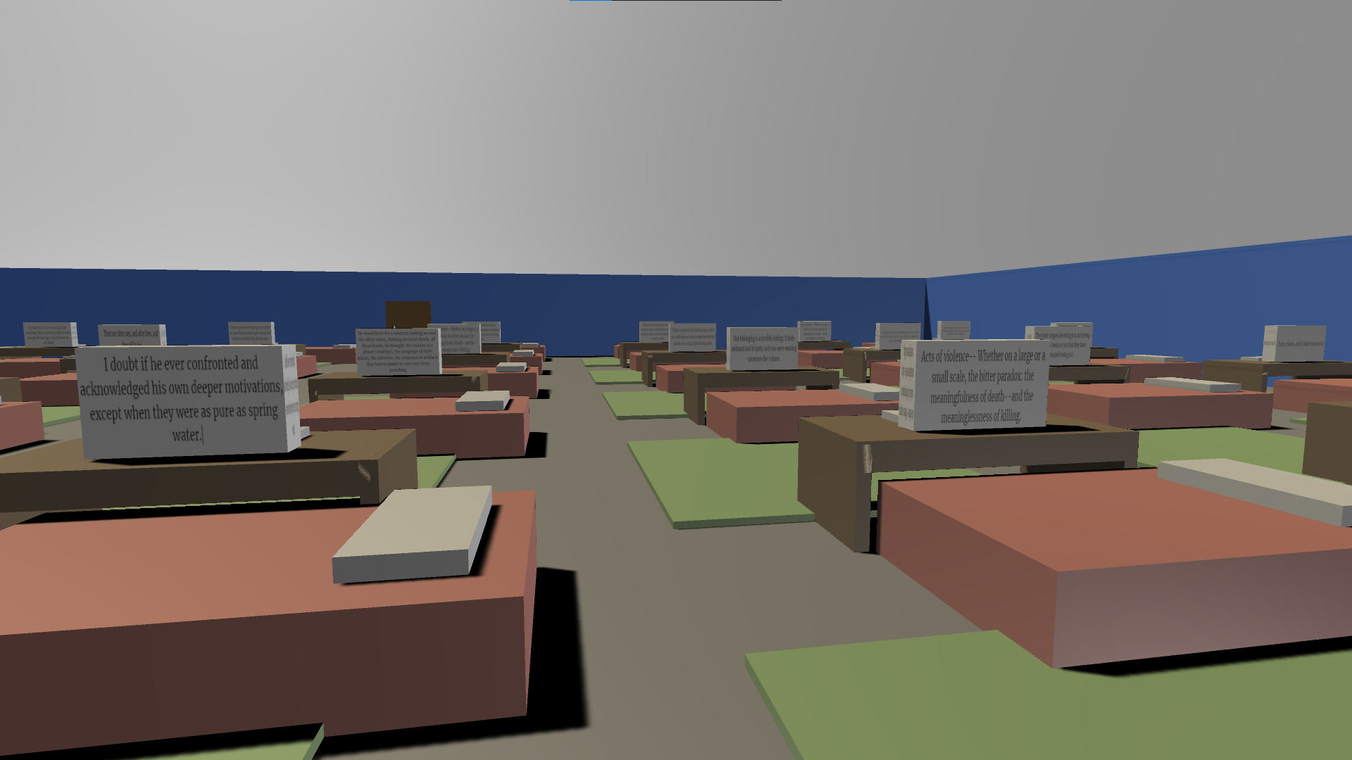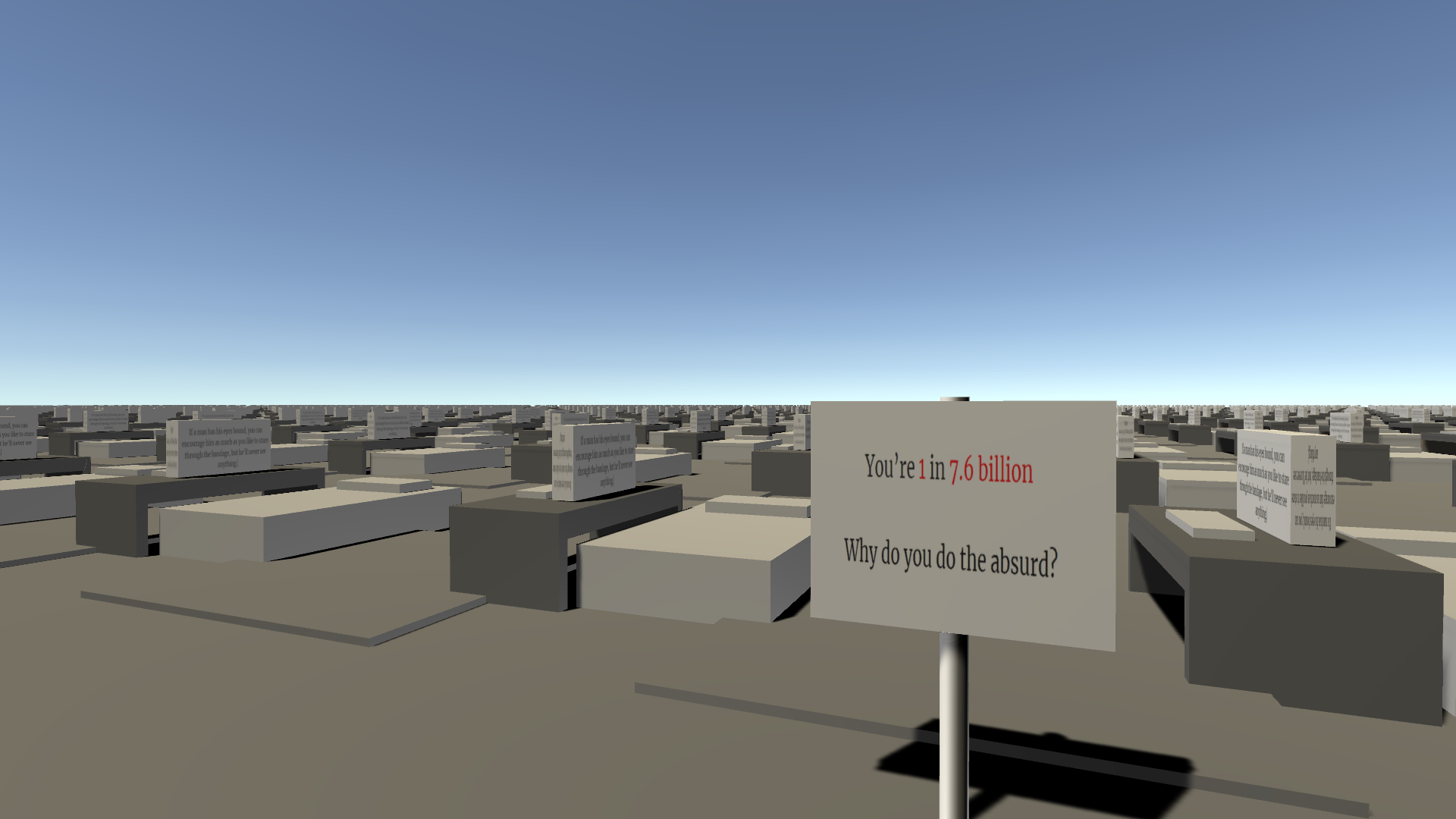 Project Summary: Existential is a walking simulator that explores feelings of isolation and existential reflection. Players begin in a bright, cozy bedroom and gradually progress into larger, muted environments, eventually arriving at a vast open field containing 8,000 repetitive bedroom setups, each displaying snippets of existential philosophy on computer screens. The game conveys emotional progression through environmental storytelling, scale, and subtle color shifts rather than traditional mechanics or dialogue.